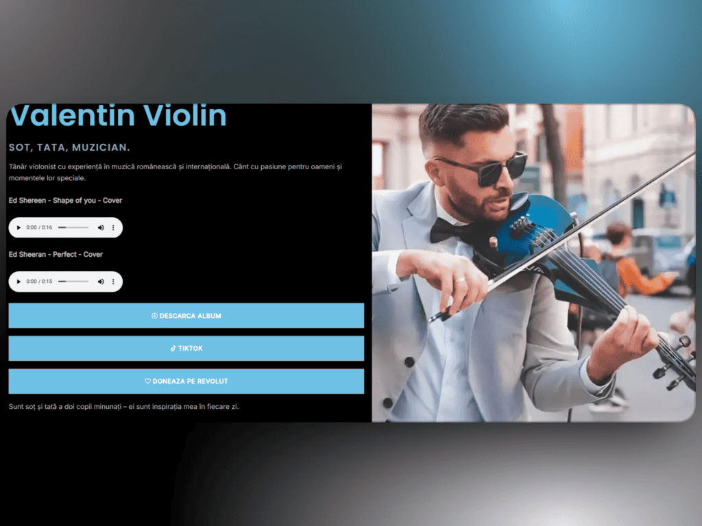 Pentru MrValentinViolin.com, am creat un website elegant și expresiv care conectează identitatea vizuală a violonistului cu emoția cover‑urilor pe care le interpretează, într-un layout mobile‑first gândit special pentru publicul său. Donatorii pot asculta rapid sample‑uri printr-un player audio interactiv integrat în pagină, pot urmări cele mai noi interpretări pe TikTok și pot susține proiectul direct prin donații pe Revolut, toate aceste elemente fiind orchestrate într-o experiență UI/UX fluidă care transformă site‑ul dintr-o simplă pagină de prezentare într-o scenă digitală personală, optimizată 100% pentru utilizatorii de pe mobil.