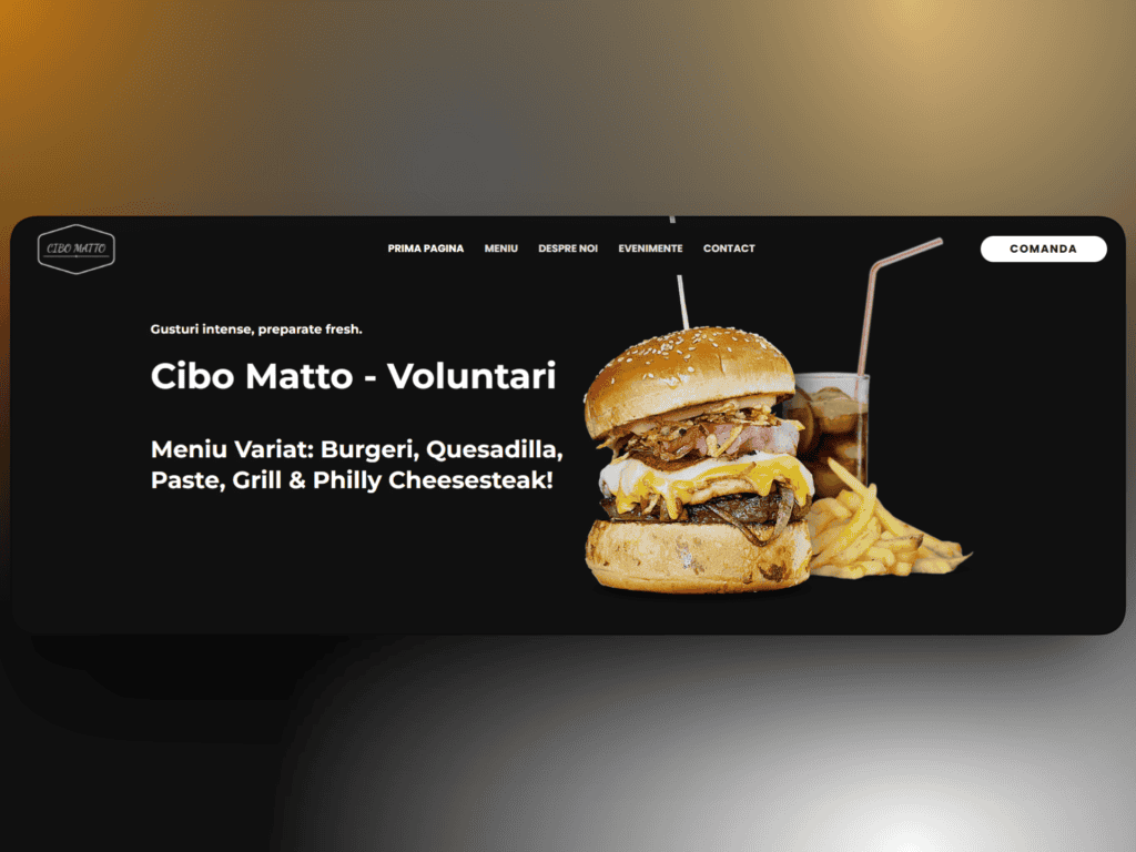 Pentru Cibo Matto, am creat o experienta digitala care stimuleaza apetitul inca de la prima interactiune. Designul site-ului pune in prim-plan fotografia de produs high-end, evidentiind calitatea ingredientelor (precum carnea Black Angus) si detaliile preparatelor. Am optat pentru o structura vizuala indrazneata, care scoate in evidenta produsele vedeta precum Smashed Burger sau Philly Cheesesteak, transformand vizitatorii in clienti flamanzi gata sa comande.