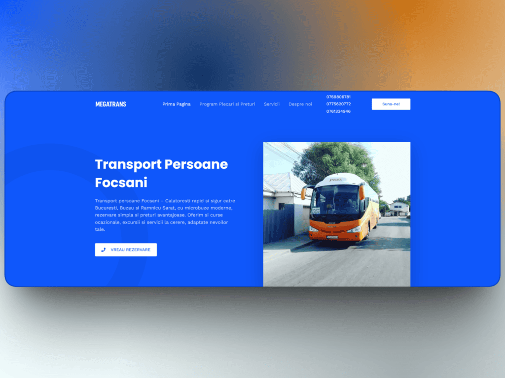 Pentru serviciul de transport MegaTrans, am dezvoltat un site de prezentare eficient, dedicat rutei Focsani – Bucuresti. Scopul principal a fost simplificarea accesului la informatii critice pentru calatori: orarul curselor, tarifele si detaliile flotei auto. Platforma ofera o experienta de utilizare directa, eliminand pasii inutili si facilitand contactul rapid pentru rezervari, consolidand astfel pozitia companiei ca lider local pe acest segment de transport.