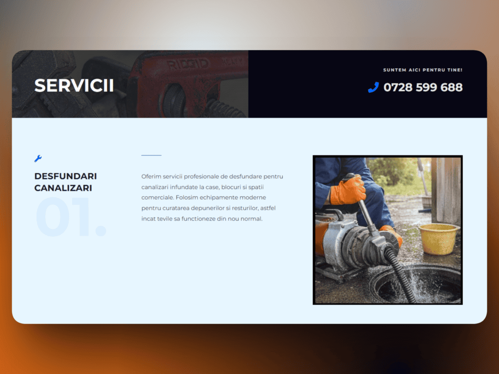 Platforma de prezentare pentru servicii profesionale de desfundare canalizări și instalații sanitare. Site-ul evidențiază rapiditatea și eficiența echipei, cu servicii precum: desfundări WC, chiuvete și sifoane, curățare tevi și coloane verticale, montaj și reparații instalații sanitare, inspecție video canalizări și intervenții de urgență 24/7. Design modern, responsive mobile-first, optimizat SEO local, cu call-to-action clar pentru contact rapid.