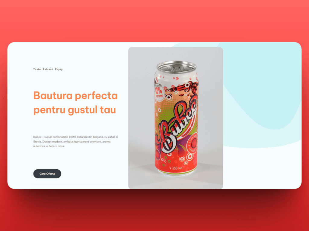 Pentru Bubee.ro, am realizat un website de prezentare pentru unicul distribuitor autorizat al celebrelor sucuri Bubee din Ungaria in Romania. Site-ul pune in evidenta atat brandul Bubee (istoric, valori, inovatie in ambalaj), cat si gama completa de produse: sucuri carbogazoase cu zahar si Stevia, cocktailuri RTD, spritzere pe baza de vin si hard lemonade. Fiecare sortiment are pagina dedicata, cu descriere de produs, beneficii si elemente de storytelling adaptate template-ului, fara diacritice, optimizate pentru Google. Structura este gandita mobile-first, cu focus pe prezentare vizuala, detalii logistice si call-to-action clar pentru comenzi si distributie B2B. Continutul SEO targeteaza cautari precum „distribuitor Bubee Romania”, „sucuri Bubee la doza” sau „bauturi carbogazoase Ungaria”, asigurand vizibilitate organica pe nisa de bauturi.