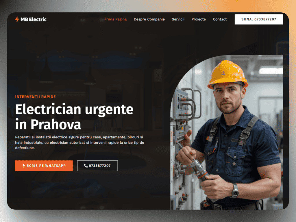 Pentru MB Electric, am realizat un website modern si bine structurat, conceput pentru persoane fizice si firme care au nevoie de servicii electrice rapide si sigure in Craiova si imprejurimi. Site-ul scoate in evidenta mesajul „electricieni autorizati ANRE”, ofera acces imediat la numarul de telefon pentru interventii urgente si prezinta clar serviciile de instalatii electrice, reparatii, mentenanta, tablouri electrice si verificari PRAM. Structura este gandita mobile-first, cu sectiuni dedicate pentru servicii, interventii de urgenta si cereri rapide de oferta, astfel incat utilizatorii sa poata lua legatura imediat cu un electrician profesionist. Continutul SEO este realizat in limba romana, fara diacritice, optimizat pentru cautari locale precum „electrician Craiova”, mentinand in acelasi timp o experienta UI/UX clara, intuitiva si usor de parcurs pentru orice tip de client.